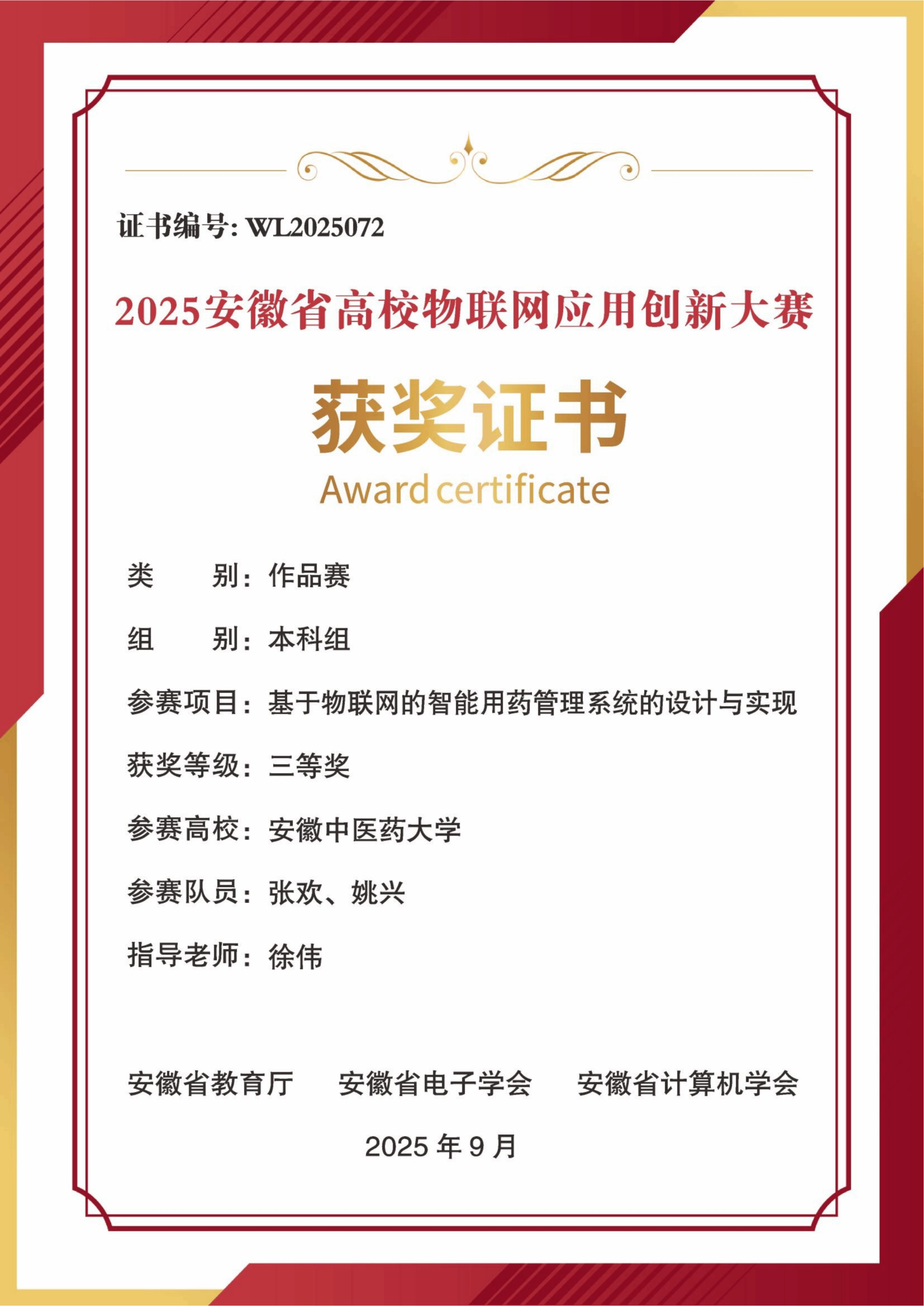 近日,学生第一党支部书记徐伟指导的《基于物联网的智能用药管理系统的设计与实现》作品荣获2025安徽省高校物联网应用创新大赛三等奖。