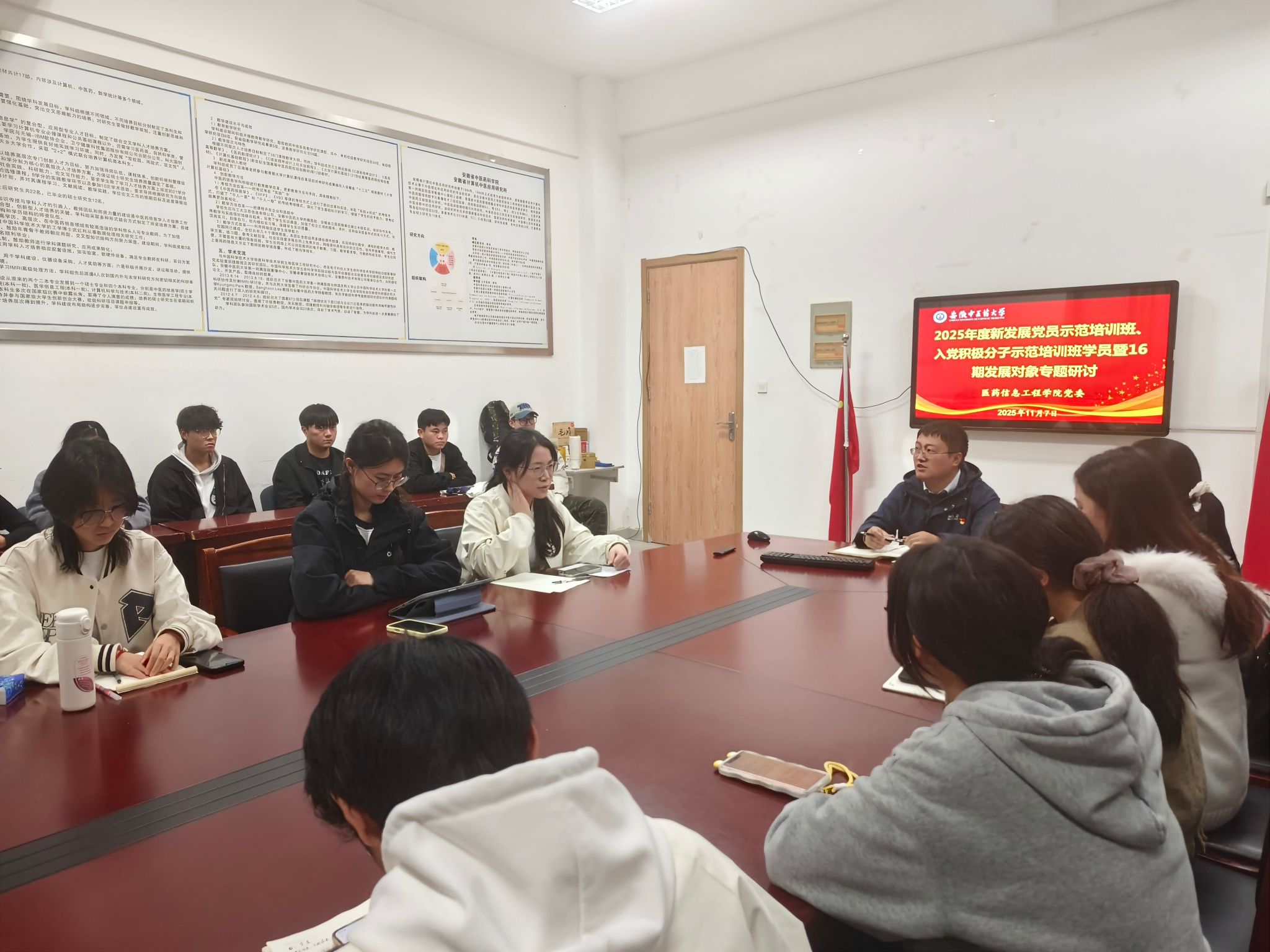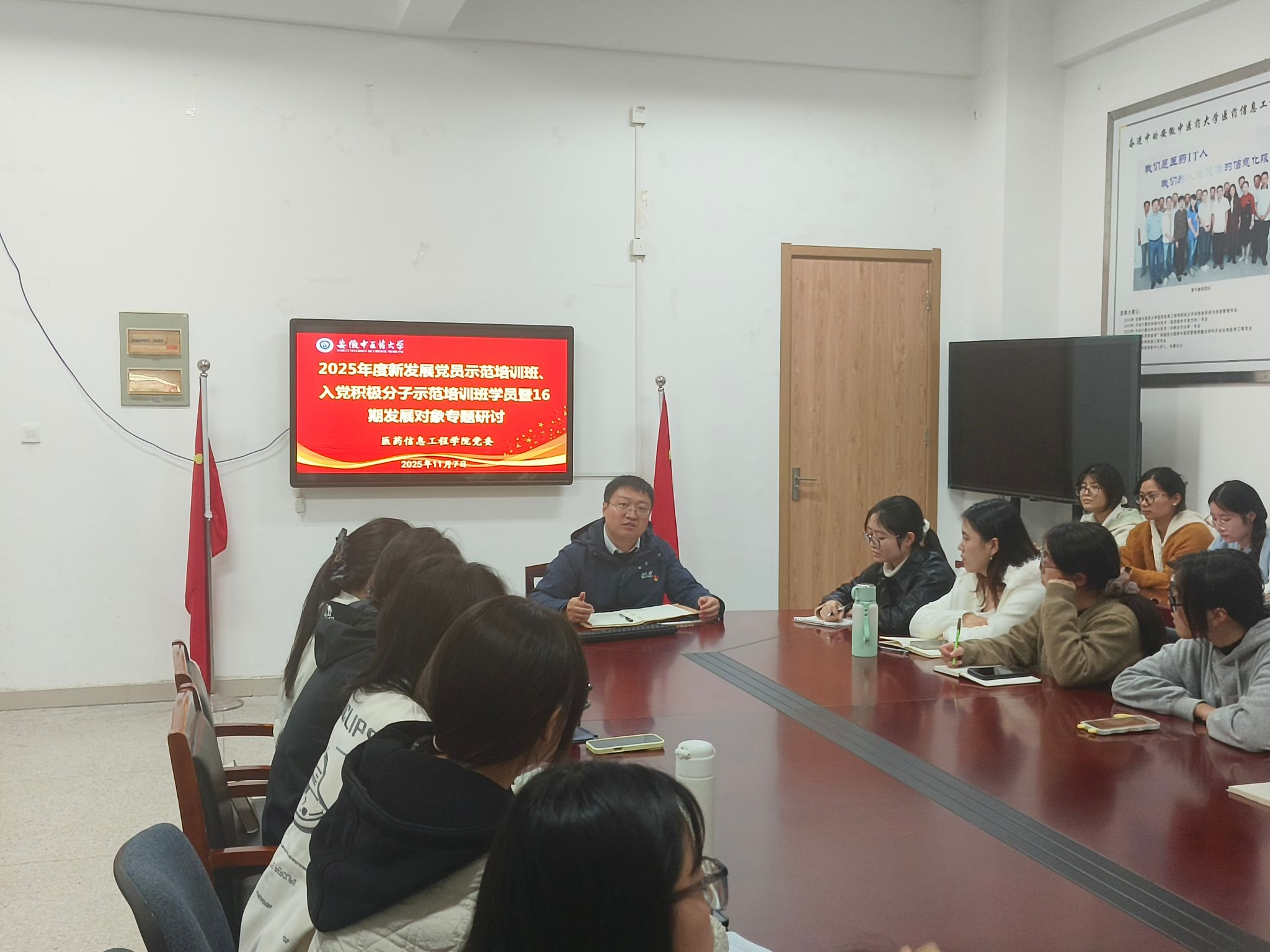 11月7日下午,医药信息工程学院组织2025年入党积极分子示范培训班学员、新发展党员示范培训班学员和第16期党员发展对象培训班学员开展专题研讨活动,研讨会以“如何做一名新时代合格的共产党员”为主题,40余名培训班学员齐聚一堂,围绕主题积极发声,各抒己见。研讨会由学院党政办公室主任、组织员、学生第一党支部书记徐伟主持。