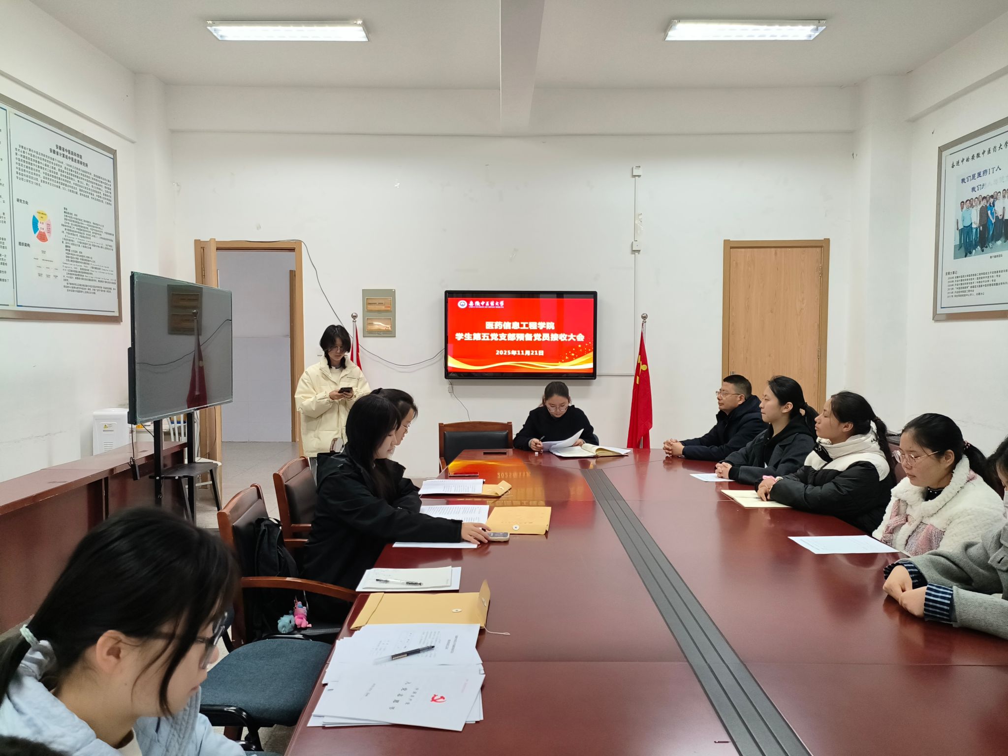 2025年11月21日,学生第五党支部召开了预备党员接收大会,并同期开展了11月主题党日活动。本次会议旨在为党组织注入新鲜血液,同时深化理论学习,凝聚奋进共识。党支部书记张薇主持会议,全体党员及入党积极分子参会。