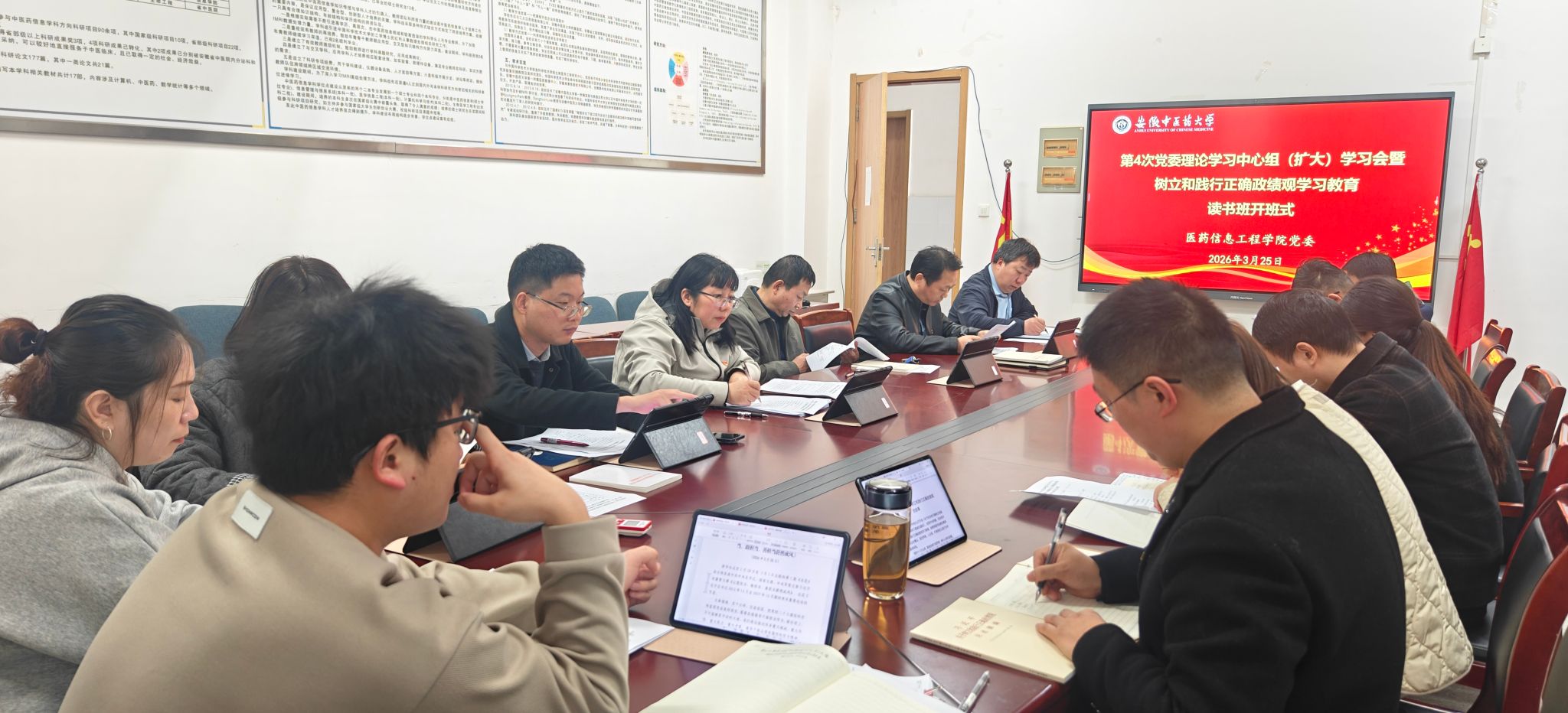 3月25日下午,医药信息工程学院举办第4次党委理论学习中心组(扩大)学习会暨树立和践行正确政绩观学习教育读书班开班式。会议由党委书记高霞主持,学院领导班子成员、党委委员、各党支部书记参加会议。