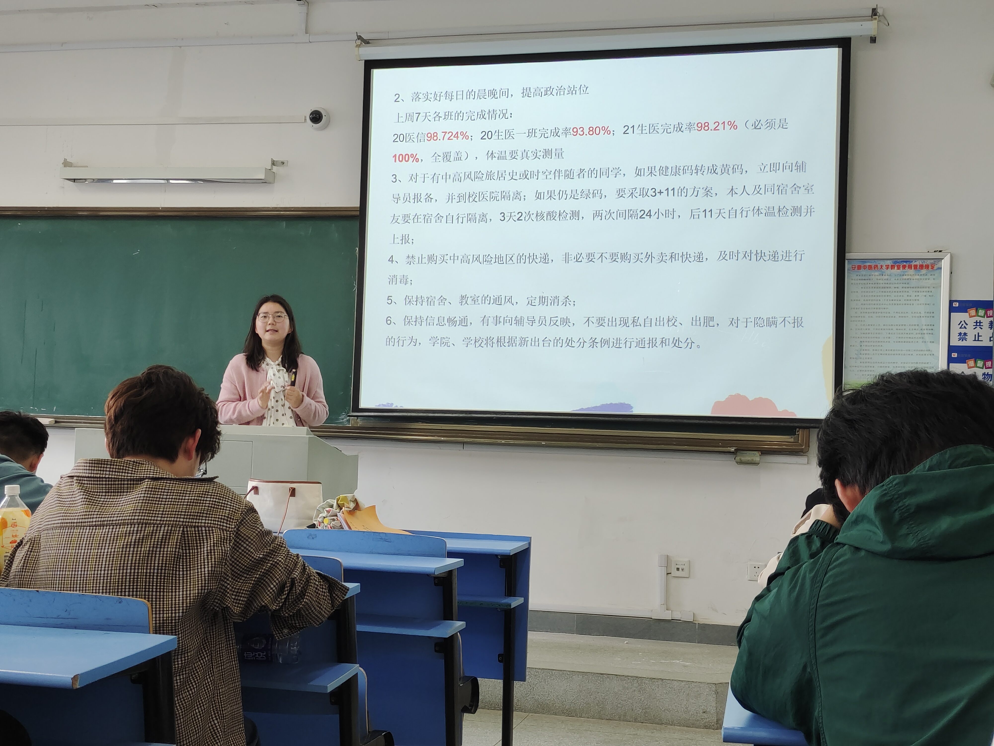 为进一步落实学校关于疫情防控工作的最新指示和相关要求,切实提高学生对于疫情防控形势的认识,医药信息工程学院于3月15日-16日,组织各班级按时召开主题班会,由辅导员传达学校疫情防控工作会议及相关文件精神。