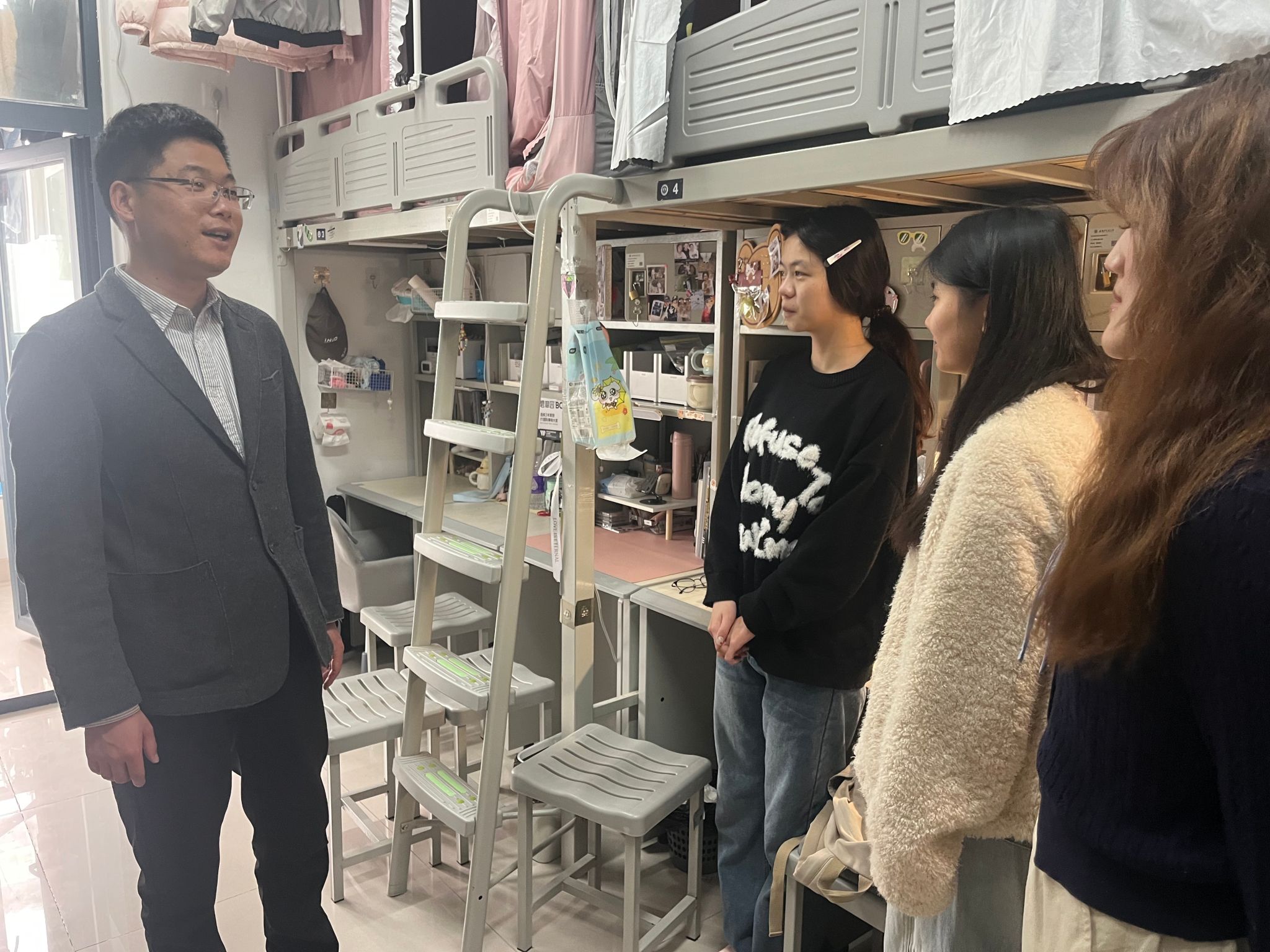 在文明宿舍建设检查上,检查小组着重查看宿舍环境卫生、物品摆放、内务整理情况,引导学生养成良好的生活习惯,保持宿舍干净整洁、通风透气。走访过程中,王向阳与同学们亲切交流,了解大家的学习生活状况、思想动态,耐心倾听学生在宿舍生活中遇到的问题与诉求,叮嘱同学们提高安全防范意识,牢记防火、防盗、防诈骗等安全知识,自觉遵守宿舍管理规定,共同维护文明有序的宿舍秩序。
