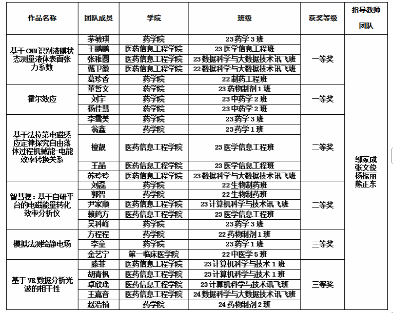 学校高度重视本届大赛,在教务处、团委等部门的大力支持下,医药信息工程学院统筹组织,大学物理课程组具体实施,按竞赛组委会要求选拔出6支队伍参赛。指导教师和学生积极备战,经过前期反复认真打磨,一路过关斩将,最终取得了骄人的成绩,斩获全国一等奖2项、二等奖2项、三等奖2项,获奖级别和数量创历史新高。