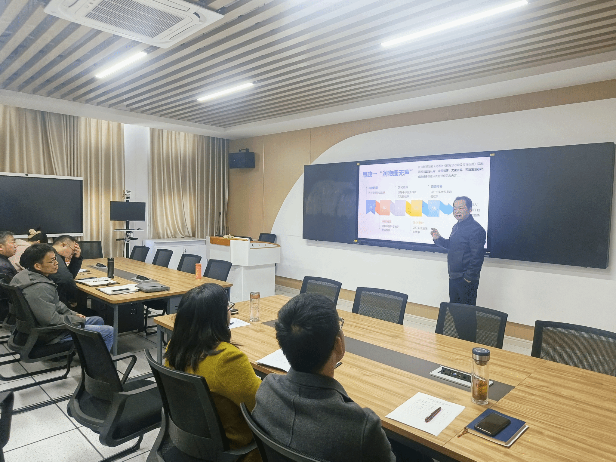 学院党委委员、副院长阚峻岭对参赛教师的表现予以充分肯定,并强调课程思政应“润物细无声”地讲好中国故事,要围绕政治认同、家国情怀、文化素养、宪法法治意识、道德修养等重点优化课程思政内容。各位评委也分别从教学设计、教学内容、思政融合等方面进行点评,为参赛教师提供了具体而有益的改进方向。