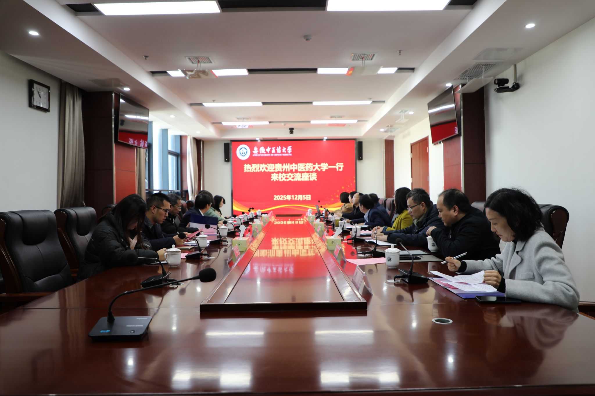 12月5日,贵州中医药大学党委常委、副校长肖政华一行来校调研交流。校党委副书记、校长许钒主持座谈会,教务处、科技处、社会合作处、信息化管理处、图书馆、医药信息工程学院等部门负责人参加座谈。