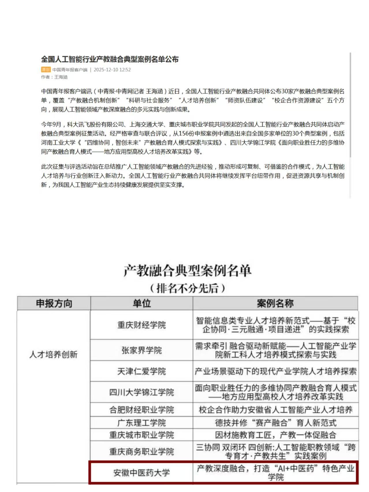 全国人工智能行业产教融合共同体于2023年10月28日成立,由科大讯飞股份有限公司、上海交通大学、重庆城市职业学院牵头,联合25个省(市)174家行业企业、科研院所、普通高校和职业学校组建成立。今年 9 月,共同体启动产教融合典型案例征集活动,历经专家组严格的资格审查与联合评议,我校以聚焦中医药产业现代化需求、创新产教融合机制为主要内容的工作案例成功入选。此次入选结果同步在新华网、中国青年报等权威媒体发布,引发社会各界广泛关注。(欧阳婷/文图 高霞/审核)